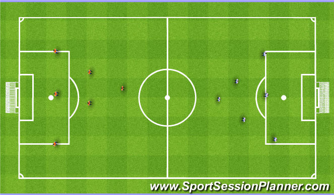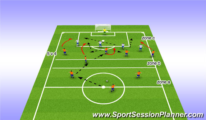 Organization ;red team - 3 defenders ,2 CM , 2 wingers ,1 forward .blue team 4 defenders n keeper. The ball starts with the defender who passes to a CM.THE cm dribbles into zone C and passes to 1 of the forwards creating a 5 v 4.