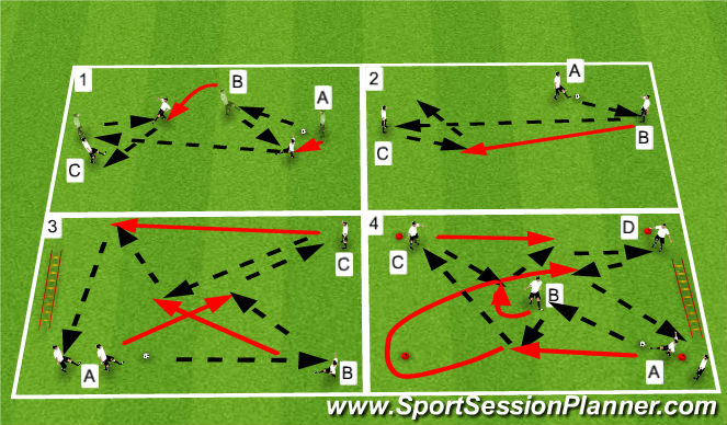 Variation 1: Up-Back-Through - same player in middle for period of time. A plays to B, B lays back to A who plays through to C. C plays to B who lays back to C who plays a through ball to A.