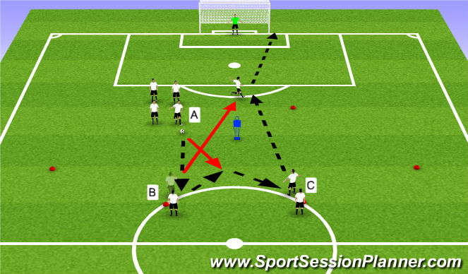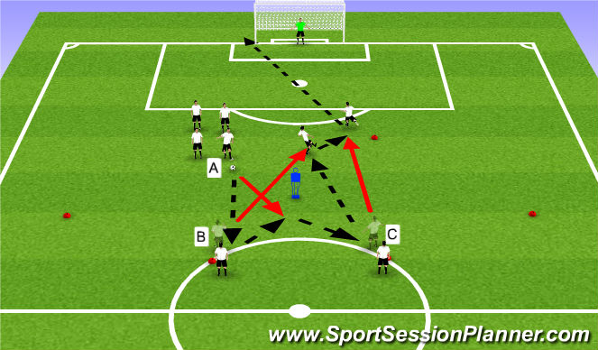 Organization: Players work in pairs, one goup going at a time [at start, only one partner plays the ball and becomes the , starting at the top of the box, working to the bottom of the box, where they will work through the sequence. A and his partner start with the ball. A plays a pass to B and immediately checks into the center of the grid [in front of mannequin if possibe]. B plays the ball back to A at an angle, then makes a run behind A [and the mannequin]. A lays the ball off to player C, then Player C sets up a give and go with player B at the top of the area to set up a shot. Player A and his partner take the place of B and C. B and C collect their ball and go to the start of the sequence.