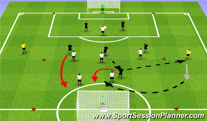 Coaching Points: accuracy of passing, crossing and finishing, variety of crosses, rythym and flow of passing to get into the wide areas, timing of runs, decision making on the ball, speed of thought, work rate, communication, movement off the ball and interplay with teammates, combinations, reinforce good habits
