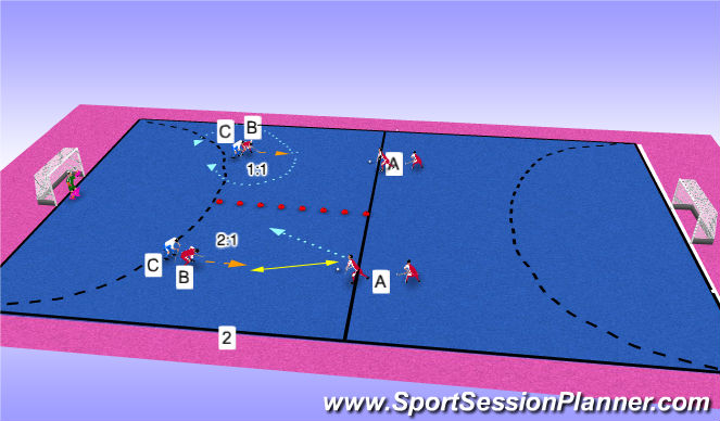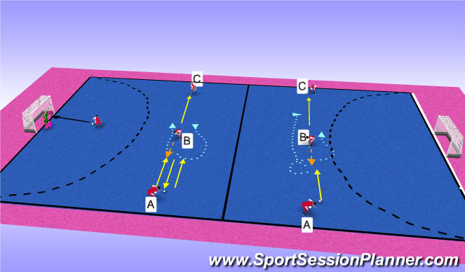 Save Image: Hockey Session Plan Drill (Colour): Desmarque, recep, 1:1 y portería Create Video: