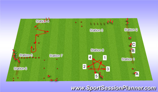 Station 1: A has ball- B travels through ladder (changing up the travel each time) As they exit the ladder A plays B who wall passes to A who sends a long ball (Right foot send) to C. Rotation B goes to A- A travels through the ladder and recieves ball from C- A sets up wall pass for C who sents long ball (right foot send) to B - A becomes C C travels to B repeat
