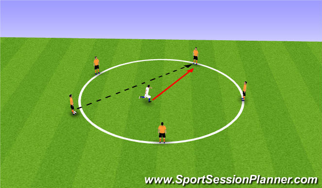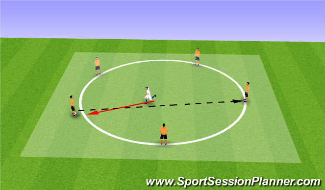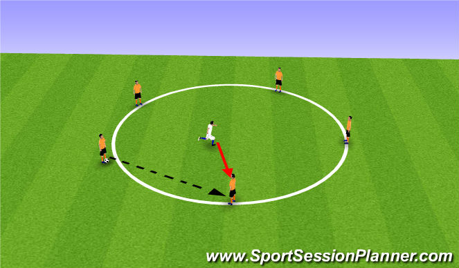 Basic Rondo to begin with, players will have to keep the ball away from the player within the middle of the circle. By starting basic with no rules or cognitive interferences this will allow players to get a feel of the session allowing them to build up a 'rhythm' with the ball.