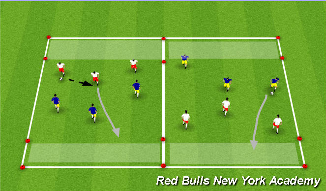 Organization: 2 Grids, set up at 30x2 yds. 6 players per grid, 3v3. 1 ball per grid.