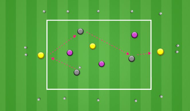 Setup: Cone off large rectangle approximately 40x20 yards. Separate into three groups of 3 players, two teams inside the rectangle and one team split into targets on each end with a neutral player in the center that will play with whomever has possession.Have sufficient number of balls spread out around the pitch so that play can continue as quickly as possible.Rules/Gameplay: