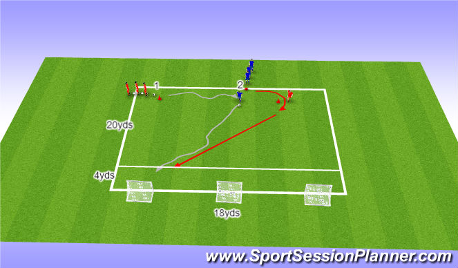 *Practice starts with: D1 dribbles the ball between the cones and steps on the ball for A2 and sprints round the far cone.