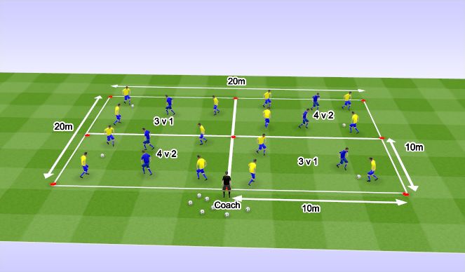 Objective: Improve ability to keep possession but also find second line (miss a player) and third line (pass through defenders) passes.