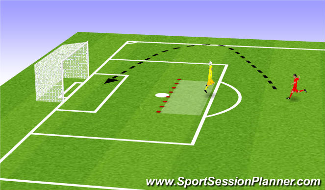 An attacking player dribbles the ball to goal and attempts to chip the ball over the goal keeper into the goal.