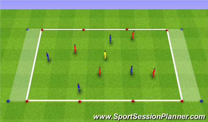 Middle Players pass the ball to the outside player. When the outside player takes their first touch, play is live and the middle player can start to close down. To score a point, the outside player must dribble to either of the three corners and stop the ball. If the defender wins it back, they can dribble to a corner and try to score.