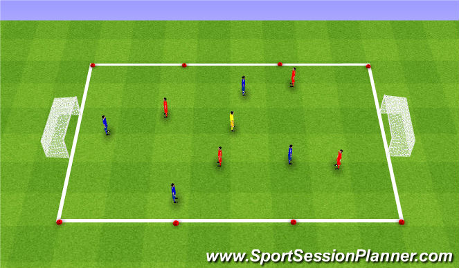 To score a goal, players must dribble the ball into the end channel and stop the ball. The neutral player cannot score.Once a team has scored, the opposition starts with the ball from their own end channel.