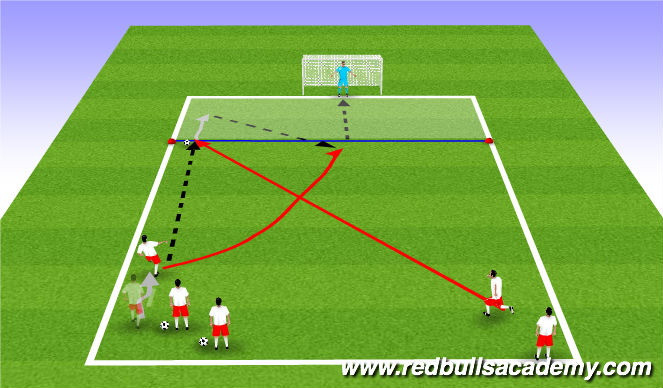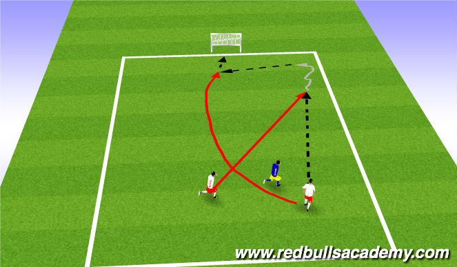 Stand in two short lines and practice diagonal runs in pairs with a goal and goalkeeper. Change lines and alternate between making diagonal runs and passing. Practice runs in both directions.