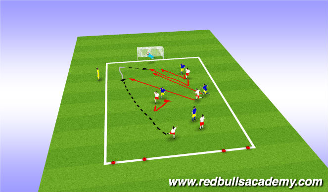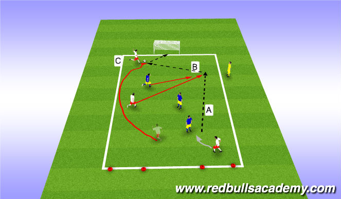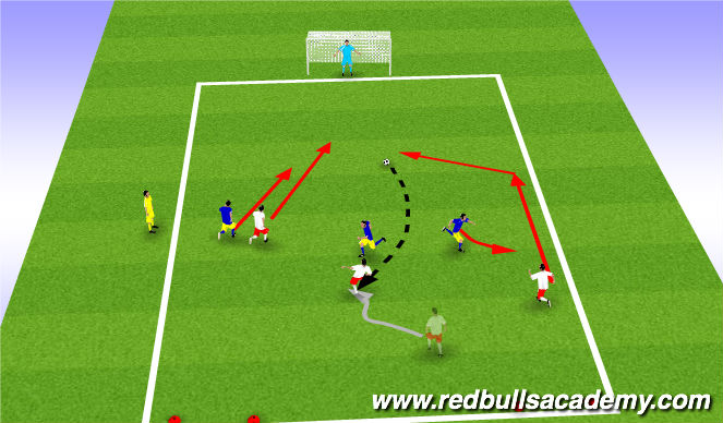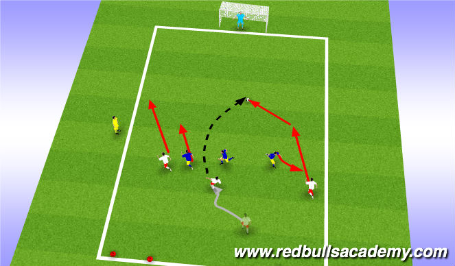 Play 3v3, players practice performing diagonal runs frequently, award extra point for goal preceded by diagonal run, or if players dribble him/herself or passes to third player instead of players makig diagonal run