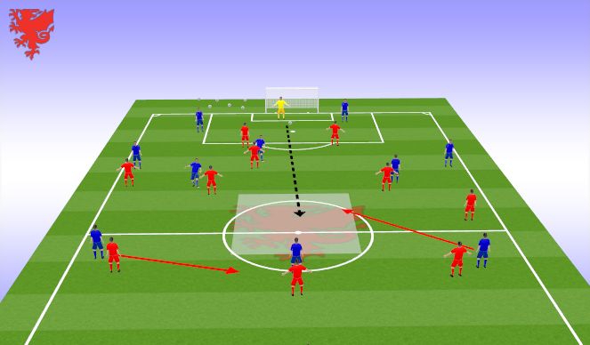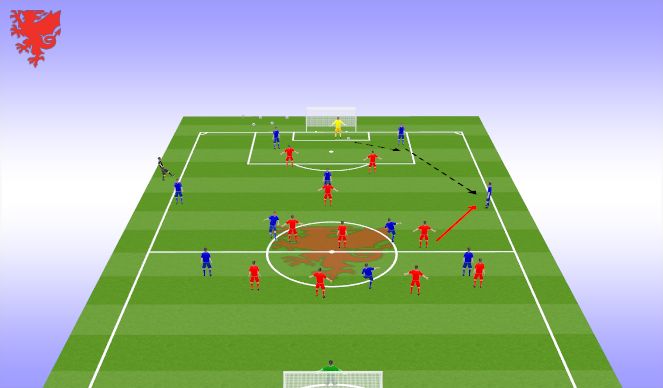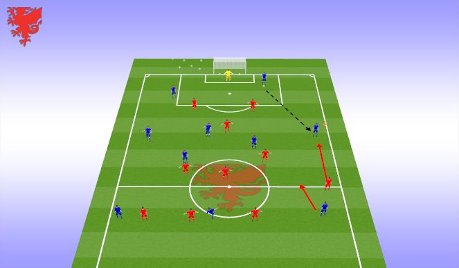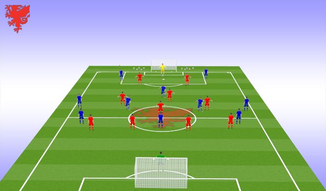 Our team (Blue): Look to build up successfully over the half way line and score against the keeper. Opposition team (Red) : Look to win possession back & score within 10 seconds.