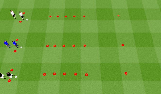 Players start in start gate, dribble through 5 serpentine cones, dribblearound far cone 5 yards away and then dribble back through serpentine cones andgive ball to partner to go. Everytime a player gets back to the start they earna point for their team.
