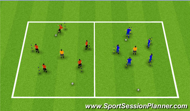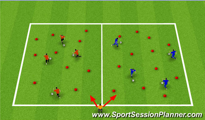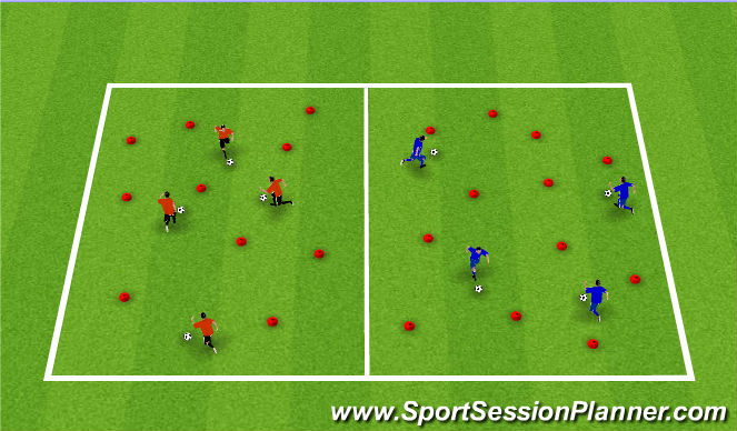 - They start by dribbling around the cones, keeping control of the ball and being careful not to touch anything, if they do, they have to leave there ball, then run around the square as quick as they can and come back to the ball.