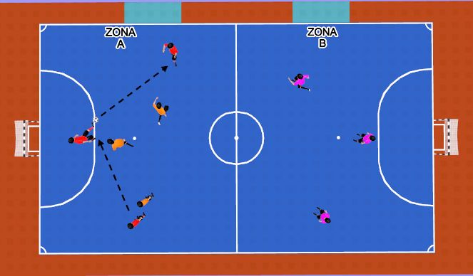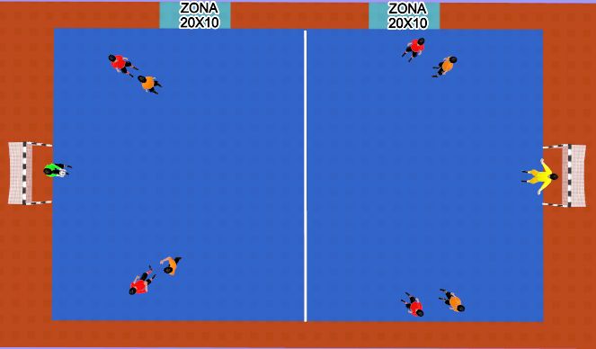 DIVIDIREMOS A LOS JUGADORES EN DOS EQUIPOS DE LOS MISMOS NÚMEROS DE JUGADORES DIFERENCIADOS POR COLORES DISTINTOS. DIVIDIREMOS EL CAMPO EN DOS ZONAS, ZONA DE ATAQUE Y ZONA DE DEFENSA Y EN CADA UNA REALIZAREMOS UN 2X2. NI DEFENSORES NI LOS ATACANTES PUEDEN SALIR DE SU ZONA, PODEMOS AÑADIR LA VARIANTE DE QUE AMBOS EQUIPOS PUEDAN MARCAR EN LAS DOS PORTERÍAS.