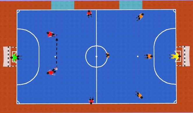 DIVIDIREMOS A LOS JUGADORES EN DOS EQUIPOS DE 4 JUGADORES Y UN PORTERO CADA UNO DE ELLOS DIFERENCIADOS POR DISTINTOS COLORES DE PETOS, SE JUEGA UN PARTIDO NORMAL, PERO CONDICIONAMOS EL JUEGO DE LA SIGUIENTE FORMA: