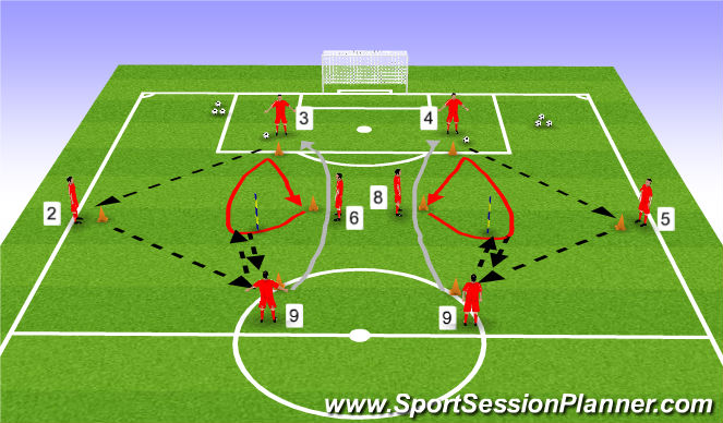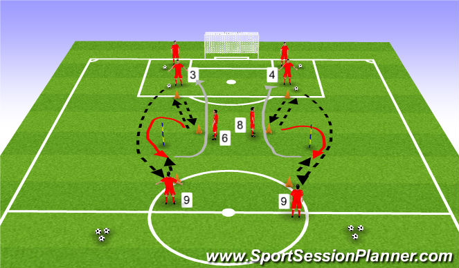 * #3 PASSES TO #6 WHO PLAYS A BOUNCE BALL WITH #3 WHO PLAYS A LONG BALL INTHE AIR TO #9. AS THIS PASS IS BEING PLAYED THIS IS #6 CUE TO TO QUICKLY REACT AND GET IN FRONT OF THE POLE TORECEIVE A PASS FROM #9 AND THEN DRIBBLE BACK TO THE START.