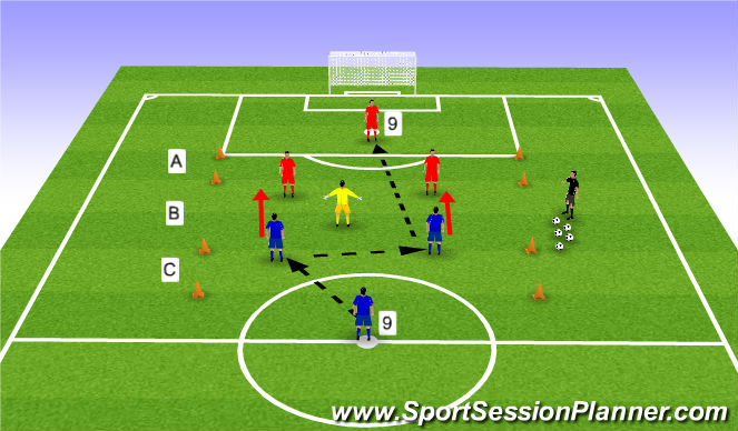 * HOWEVER IF RED #6 AND #8 WIN THE BALL, THEY ALONG WITH THE NEUTRAL PLAYER HAVE TO TRY AND KEEP POSSESSION IN GRIDS A AND B FOR A MINIMUM OF 6 PASSES BEFOE RED #9 PLAYS A LONG BALL TO BLUE #9. BLUE #6 AND #8 CAN ONLY RECEIVE BALL IN GRID C AND THE GAMES CONTINUES.