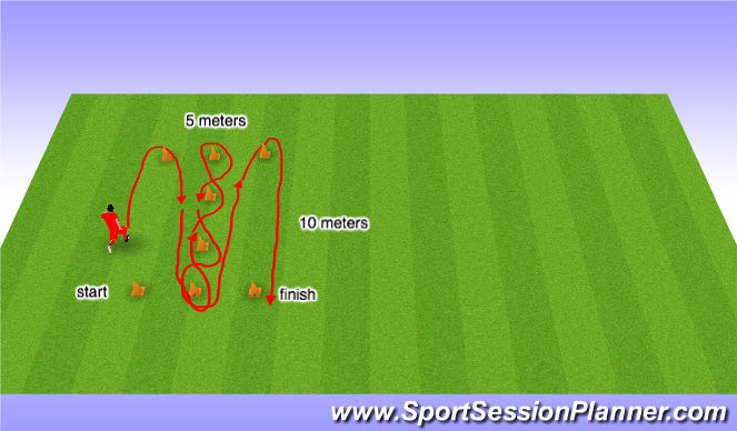 This test measures agility and body control. The player starts by sprinting forward, around the corner cone, weaves back through the middle cones toward the top, turns and then weaves back through, around the other corner cone, and sprints to the finish.