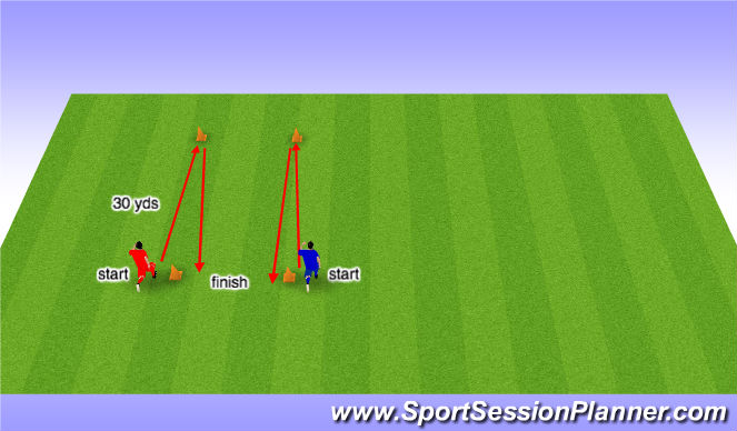 Mark off 30 yards with 4 cones. Two players can go at a time if you have two timers. Players start at the first cone, run forward to the second cone, touches it and runs back through the finish line. This test measures all out speed as well as the ability to turn quickly. The players get two attempts. Record the best time.