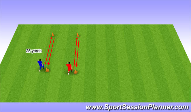 Mark off an area of 25 yards with 4 cones. Player begins by running toward the 25-yard mark, touches the cone, turns, and runs back to the original cone. Player repeats this 5 more times for a total of 6 trips equalling 300 yards. Players get two turns. Record the best time.