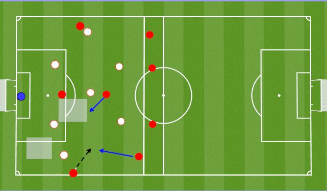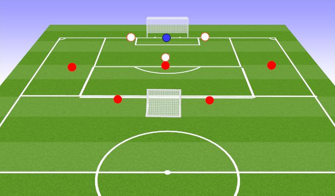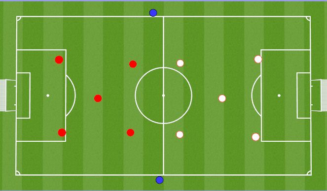 Conditions of play: Normal soccer rules apply. Restarts are from GK playing into any of the 4 red targets in the end zone, coach playing the ball in or a throw in. White can only score a point through dribbling the ball into the end zone. 2 of the LB,RB,CM,CM must stay in the end zone in both phases (in and out of possession) but are still able to be used in possession, the end zone is a free space.