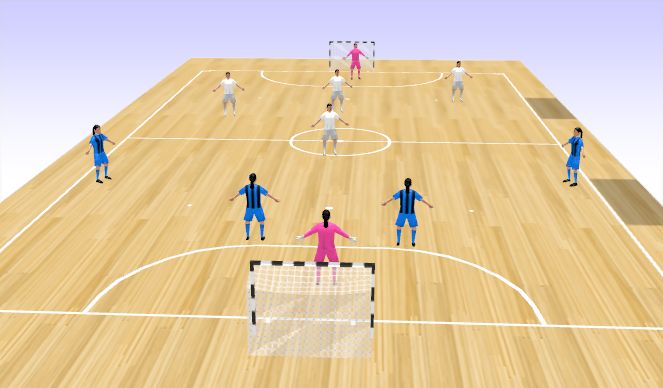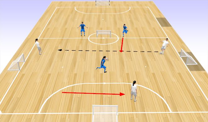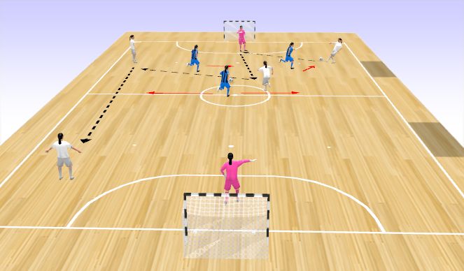 Constraints: Both goalies are support for the attacking team trying to keep possession. Once the ball is recovered focus team can score in either goal.