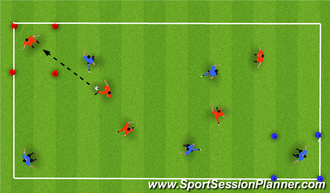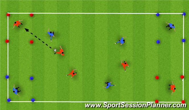 The player inside the square must now play out to one of the corresponding coloured players and they must now try to get the ball to the player in the opposite corner.