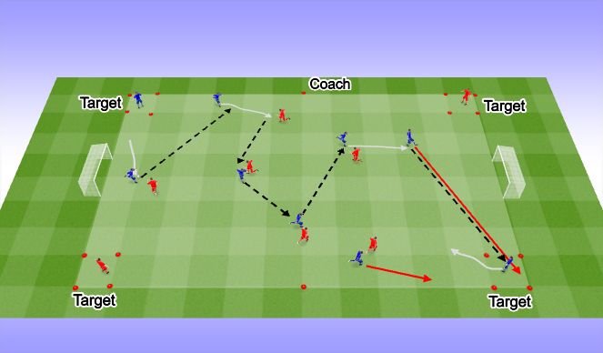 6v6 plus 2 target players for each team. Both teams try to keep the ball away from each other and they both score by combining to connect with their target players on the corners who are diagonally placed opposite each other. When a point is scored, the player that plays into the target player swap position with the target player.