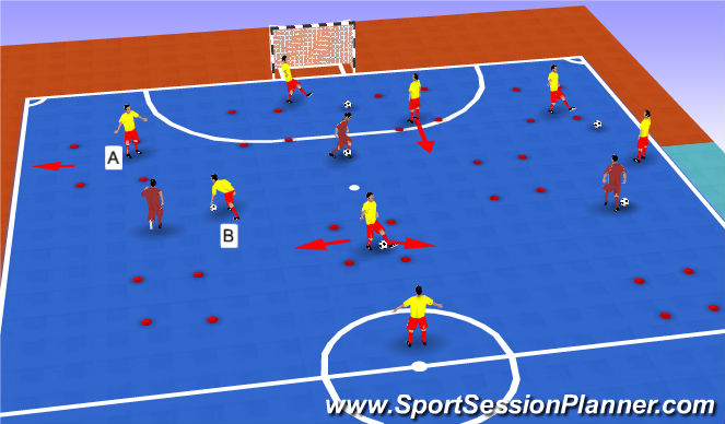 Player A recieves the ball but can only recieve the ball in a red box, Player B then moves to find a free red box, Player A then plays to B, and vice versa.