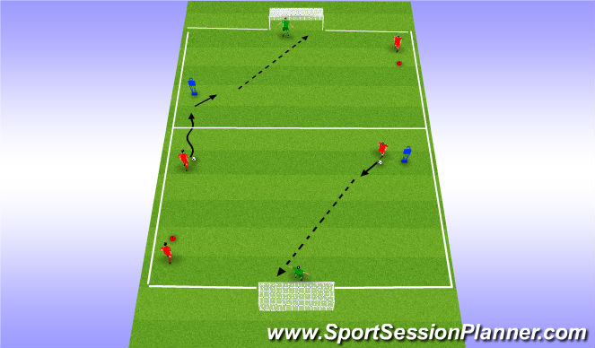 The players dribble to the mannequin (or cones) and shape their body to perform a feint/turn (varied by the coach) past the mannequin followed with a shot at goal.