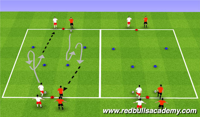 - Player 1 dribbles towards far blue cone and performs turn. Perform a 2nd turn in close blue cone then make pass to teammate.