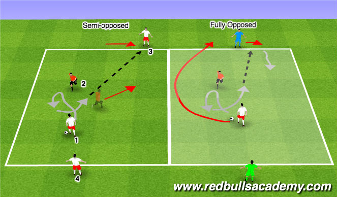 -Player 1 dribbles at angle - Player 2 (semi-opposed) cuts lane - Player 1 turns away and towards opposite angle. Player 1 makes pass to Player 3 CF..