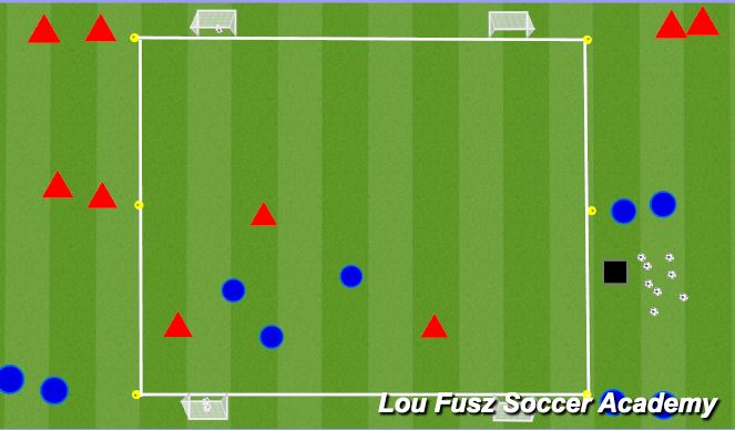 Organization: 25x20 yard grid (adjust as needed) with 4 small goals, 2 teams of 9 split up at the yellow cones, coach on the side with balls