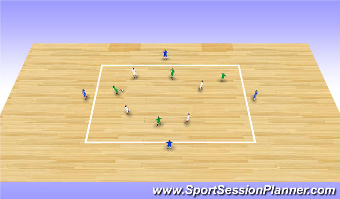 Organisation - 2 temas playing inside the square and one team outside as support. Only allowed 2 touches. They need to do 5 passes between them, and the swap with the team outside. Swap between: Only allowed to pass with the sole and free passing. Defending team can't tackle only intercept passes.