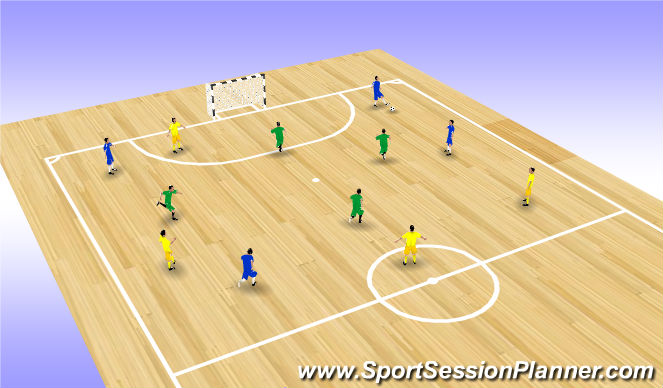 Organisation - Team in the middle (greens) try to win ball posession. Blues and yellows try to keep ball posession. Teams with the ball only allowed to do 2 touches.