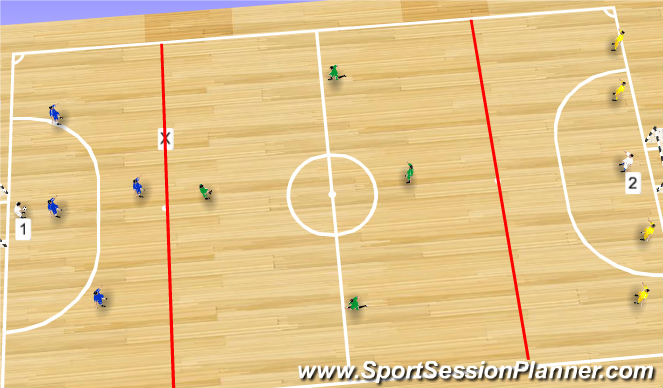 Organisation - GK 1, feed the ball to zone A or B, and green team try to score against blues. If they score they wait for GK 2 feed the ball to line X or 10m line and the attack VS yellows. In the first attack if blues win ball posession they try to pass the halfway line.