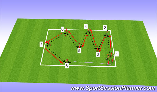 Instructions: player 1 passes to player 2 and follows pass. player 2 does same to player 3 and so on and player 8 dribbles ball to join back of player 1's. once 1st player is clear of player 2 next player 1 can start. avoid ball hitting cones. players receiving the ball to work around and behind cones.
