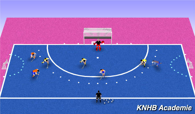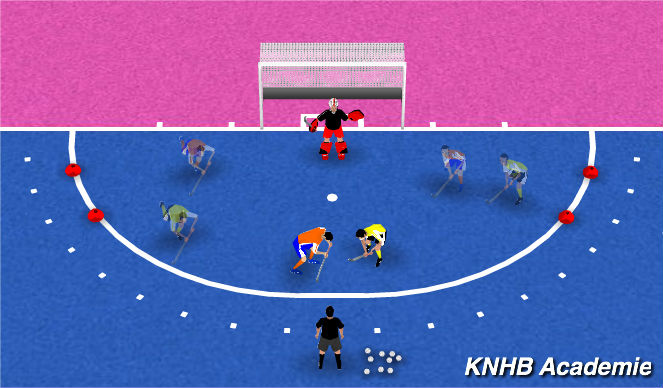 Er wordt een partijvorm in de cirkel gespeeld. Een team scoort bij de keeper en een team scoort in de doeltjes op de cirkelrand Bij een overtreding die niet in een voordeelsituatie resulteert en als de bal het speelveld verlaat zal de trainer een nieuwe bal inbrengen. De aanvallende partij scoort een punt als zij bij de keeper scoren. de verdedigende partij scoort een punt als zij in de kleine goaltjes scoren. Als er een overtreding gemaakt wordt die normaal in een strafcorner zou resulteren dan wordt er een halve punt toegekend aan de aanvallende partij