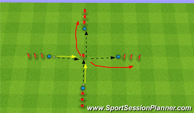Player with a ball passes into the player in the middle who controls the ball dead with his first touch. The player who passed runs onto it and passes out straight ahead. The player who controlled the ball follows the pass out and joins the back of the line. The next ball is then passed into the new middle player and the play repeats itself.
