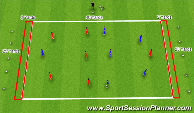 The Red team will try to keep possession and play through the zones to their midfielders and then their attacker who will attempt to score by putting his foot on the ball in the red end zone.
