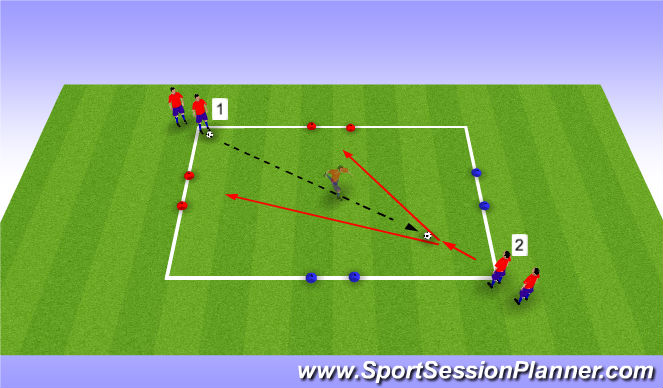 1v1 Exercise: player 2 receive pass from player 1, who apply pressure quickly to defend. Player 2 must escape pressure to dribble through either of the red goals. Should player 1 win possession player 1 dribbles through either of the blue goals.