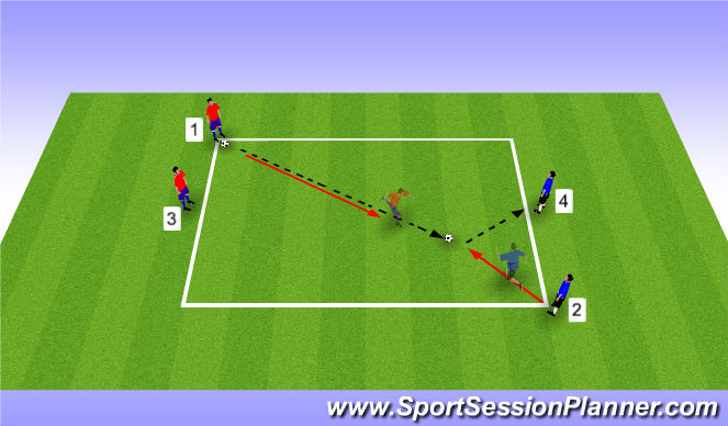 If player 1 wins the ball back from player 2 then player 1 quickly looks to play a forward pass to player 4.