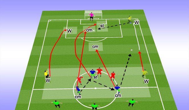 Teams of 3, plus 2 neutrals (wingbacks) play to keep the ball in an area marked (3 touch), once 5 successive passes are made, the team in possession looks to break the line with a through ball into space. Then players make runs into their guided finishing areas. The team that made the attack then swap out for the next group of 3. Wide players always stay in play.