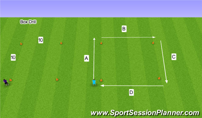 This is exercise one. A- sprint forward, B- side shuffle, C- back pedal, and D- side shuffle Always face forward. Box is 10x10 yrds.