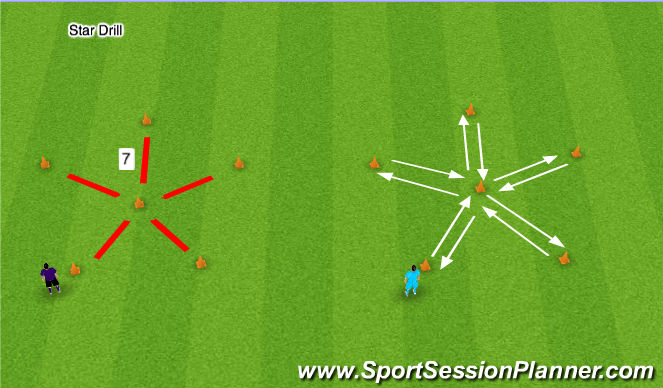 Cones made into a star shape, 7 yrds apart. 2 players race they must touch each cone with their hand, sprinting in and out on each side. 5 races, losers have 10 standing squats. Another player in line says go.