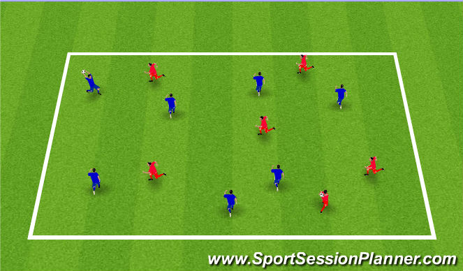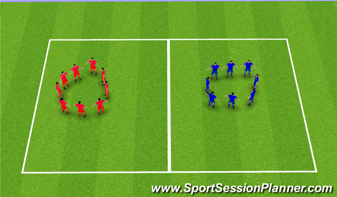 Blues are split into 2 teams as are reds. 1 blue team will play the red team on one pitch and the other blue and red team will play on the other pitch. Set up like above.