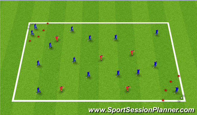 Keep the same groups from the arrival activity, start with 4 balls between 20 players. The aim of this is to get players practicing throwing and catching. The players with the ball will throw the ball to anyone, to start they do not have to necessarily be on their team, this continues so players have plenty of chances of throwing and catching. The session will then progress so players have to throw the ball under arm to someone and then roll and finally bounce it.