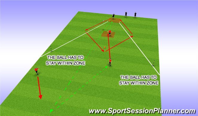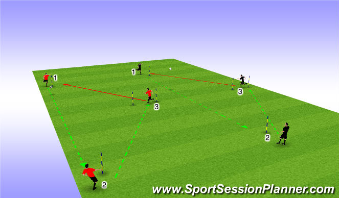 PROGRESS THE SESSION BY MAKING IT A BIT MORE COMPETITIVE AND PRESSURED BY SEEING HOW MANY TIMES THEY CAN PASS THE STARTING POST (1) IN A TIMED SESSION OF SAY 2 MINUTES. IT STARTS WITH A LONG BALL PASS AS PREVIOUS FROM 1 TO 2, 2 THEN PASSES ALONG THE GROUND TO 3, 3 THEN DRIBBLES BALL BACK TO POSITION 1. EVERY PLAYER FOLLOWS THEIR PASS TO ROTATE TO THE NEXT POSITION. KEEP THE TEMPO HIGH
